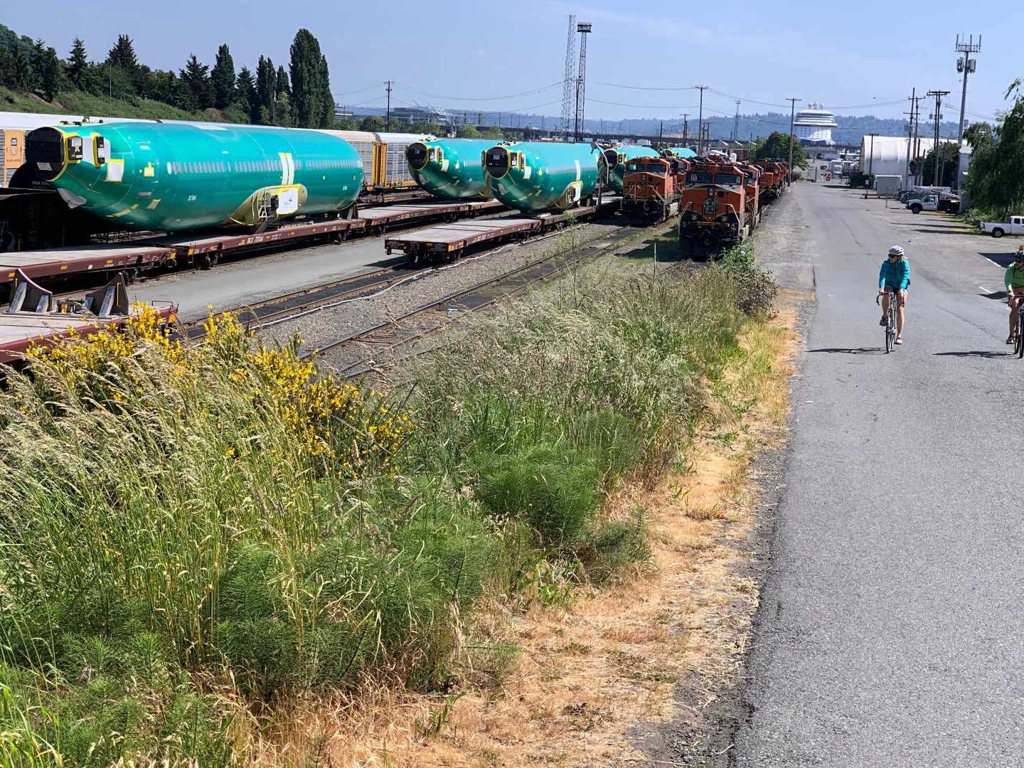I was interested to see aircraft bodies loaded on flatbed rail cars probably headed to the assembly plant in Renton. May 28, 2023.