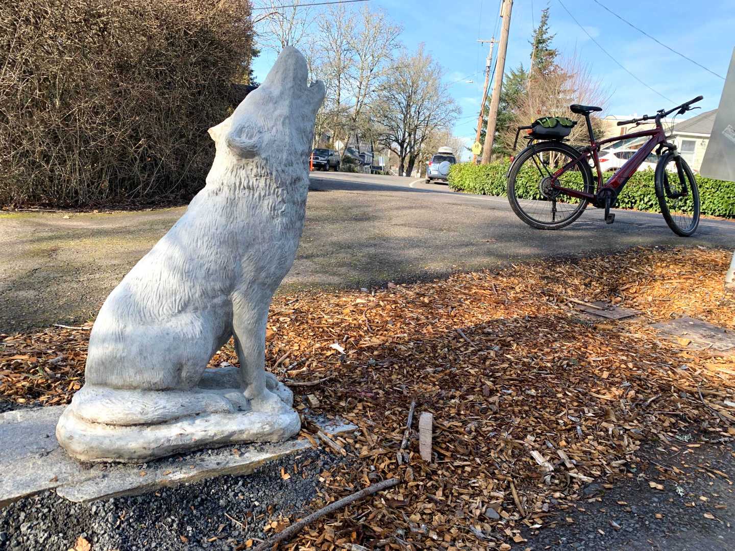 I've joined two friends who enjoy a fast paced walk from my neighborhood, Garden Home, through residential streets and trails to a coffee shop in Multnomah Village. Our route passes through Maplewood where an open jawed wolf sculpture stands guard.